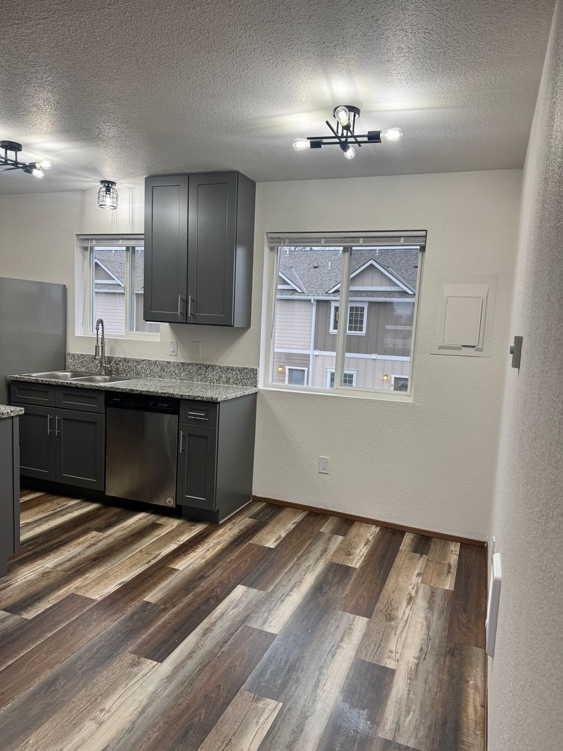 2 bed 1 bath upstairs apartment for rent. Washer/dryer in unit, all stainless appliances including built-in microwave, full size cabinetry, granite countertops, easy care vinyl plank flooring. Quiet complex with great neighbors and off street parking! Locally owned and managed as well.